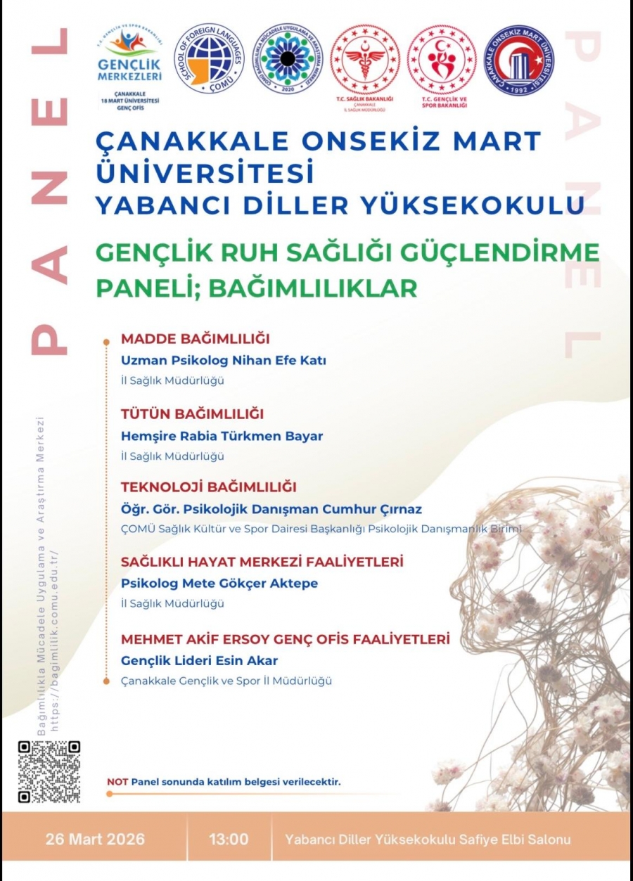 Çanakkale On Sekiz Mart Üniversitesi Yabancı Diller Yüksekokulu bünyesinde, 26 Mart 2026 tarihinde13.00'da, bağımlılıklar üzerine Gençlik Ruh Sağlığı Güçlendirme Paneli yapılacaktır. Panel sonunda katılım belgesi verilecek olup, tüm öğrencilerimiz davetlidir.