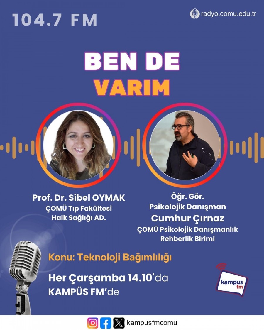Bu hafta, Ben de Varım programının ev sahipliğini yapan, Bağımlılıkla Mücadele Uygulama ve Araştırma Merkez Müdür Yardımcımız Prof. Dr. Sibel Oymak hocamızın konuğu, gene Merkez Müdürlüğümüz Yönetim Kurulu Üyesi Öğr. Gör. Psikolojik Danışman Cumhur Çırnaz'dı. Teknoloji Bağımlılığı ile ilgili, öğrencilerimizi bilgilendiren faydalı bir program oldu.